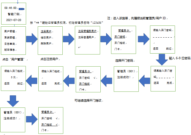 注:“123456”為出廠默認的管理員密碼,當(dāng)注冊管理員用戶后,該密碼會自動失效,下次進入系統(tǒng)菜單需要驗證已經(jīng)注冊的管理員指紋或密碼。